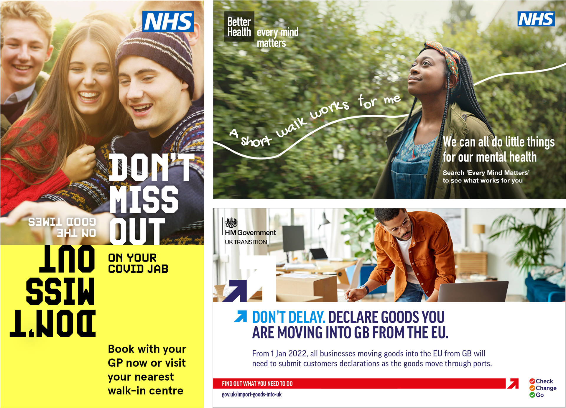A selection of campaigns for the NHS and DEFRA aimed at improving mental health, Covid jab uptake and post-Brexit finances.